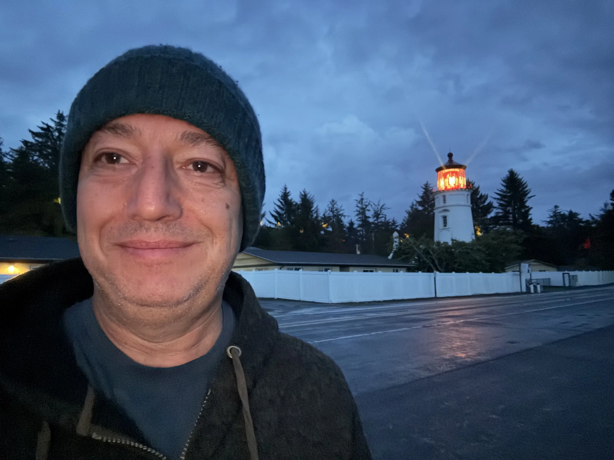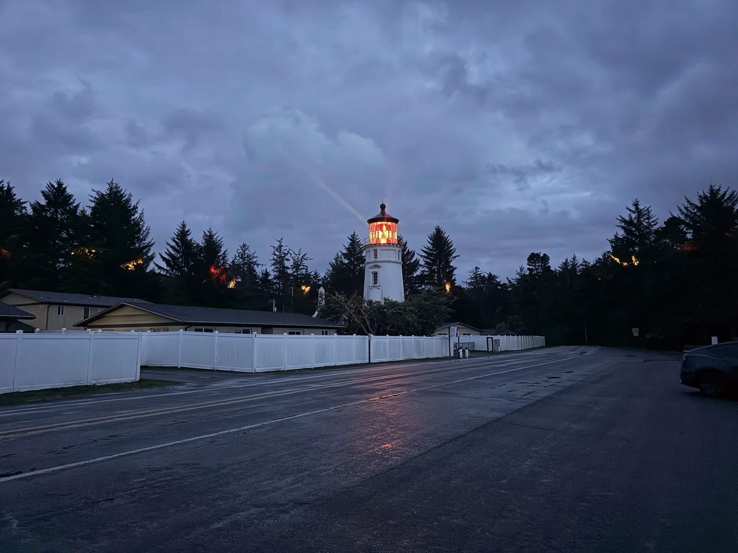 After the rainy lighthouse visit, we drove back south towards Florence. First we found a bar/restaurant with a dog-friendly covered patio for lunch (it was still raining, so that was a good find). Then we went to a shopping area in Florence, and schmoozed the stores for a while, before saying goodbye to our friends, and heading back to the RV for a quiet afternoon. In the evening, we drove back up to the Umpqua River Lighthouse, to see how the lights from the tower lights up the surrounding trees.
