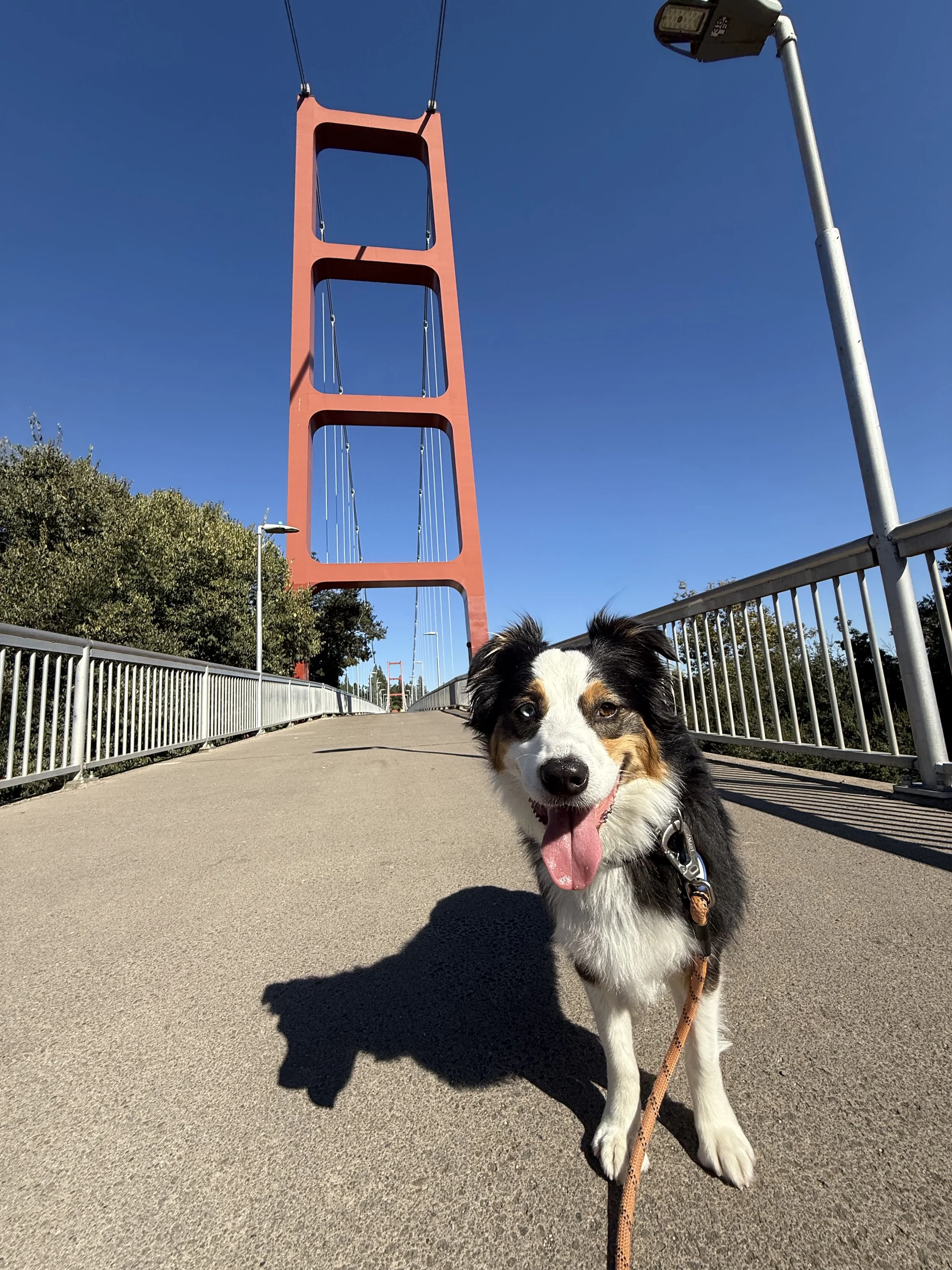 Rosie walking over the Guy West Bridge near Sac State.