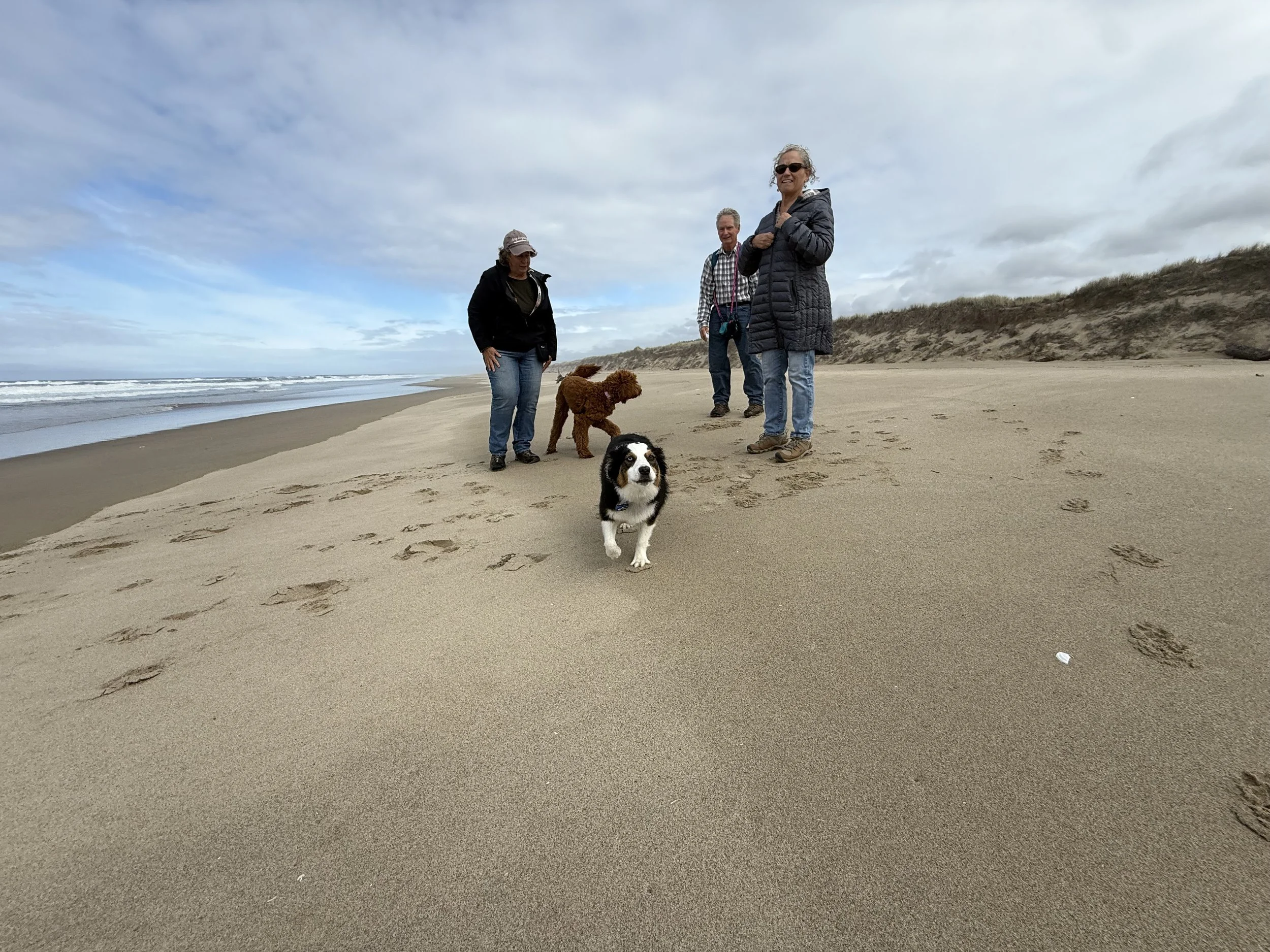 The next day, we met up with our friends, and their two doodles. We started with a quick photo op at the Umpqua River Lighthouse, where we could see the dunes from above. Next, we did a hike around nearby Lake Marie (and got a closer look at the dunes). Then we took the dogs to run off leash at the nearby beach, and took a long walk along a miles long beach where we saw no other people the entire time. The dogs, especially Rosie, had a great time.